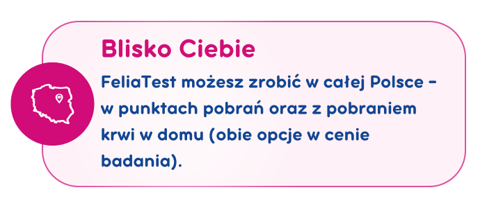 FeliaTest jest dostępny w prawie 300 lokalizacjach do pobrania próbek lub z możliwością pobrania próbki w domu na terenie całej Polski. Koszt pobrania próbki jest już wliczony w cenę badania, bez względu na to, czy decydujesz się na pobranie w placówce, czy w domu. Aby znaleźć najbliższy punkt pobrań w Twojej okolicy, prosimy o kontakt pod numerem tel. 665 761 161
